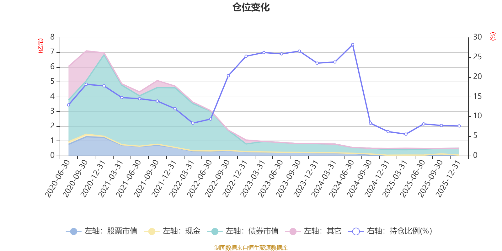 據(jù)定期報(bào)告數(shù)據(jù)統(tǒng)計(jì),近三年平均股票倉位為16.46%,同類平均為19.2%。2024年上半年末基金達(dá)到28.23%的最高倉位,2025年一季度末最低,為5.5%。
