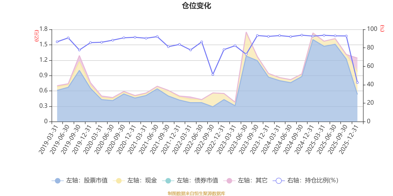 據(jù)定期報(bào)告數(shù)據(jù)統(tǒng)計(jì),近三年平均股票倉(cāng)位為86.25%,同類(lèi)平均為72.57%。2024年三季度末基金達(dá)到93.78%的最高倉(cāng)位,2025年末最低,為42.39%。