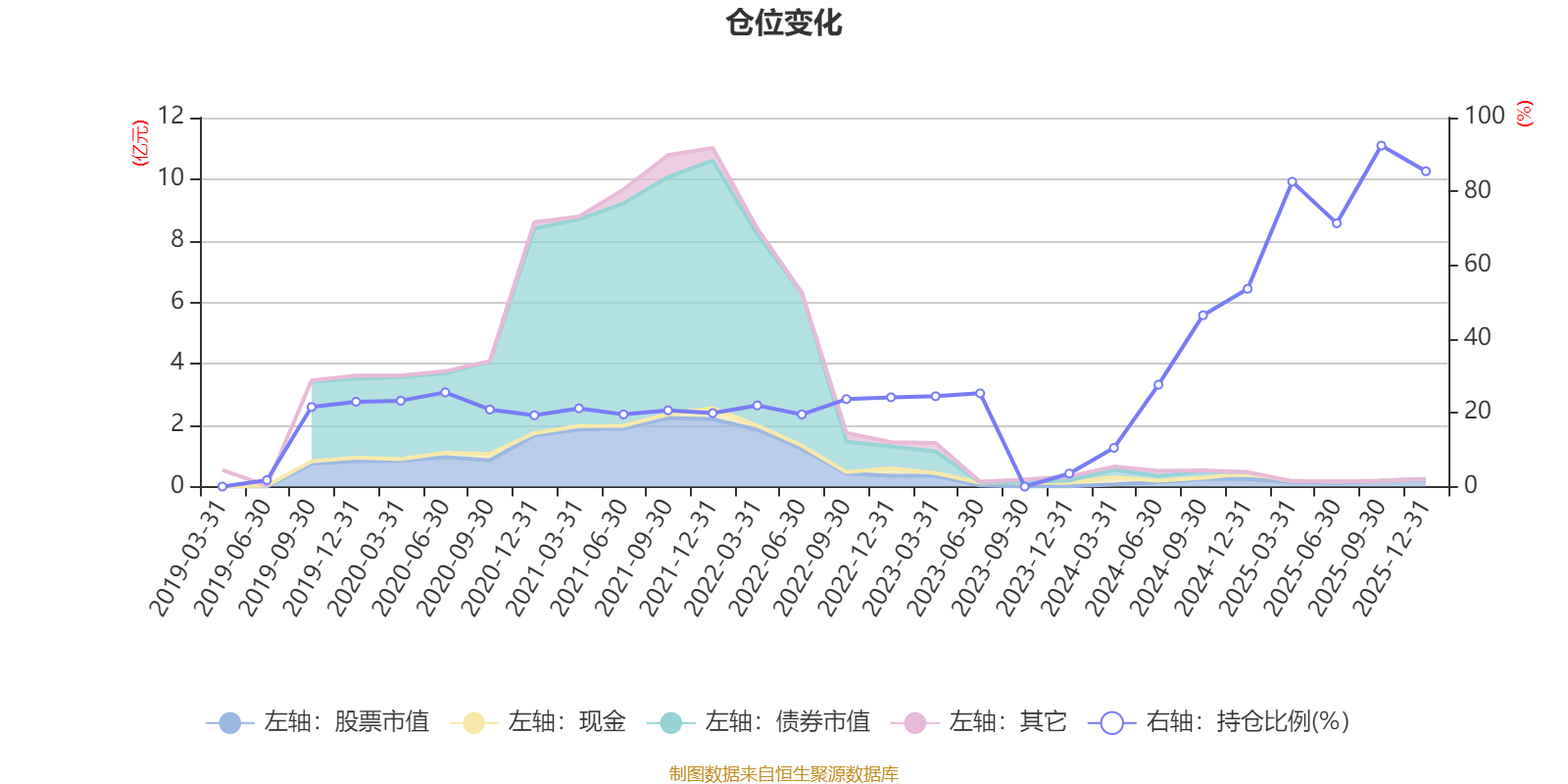 據(jù)定期報告數(shù)據(jù)統(tǒng)計,近三年平均股票倉位為43.6%,同類平均為72.57%。2025年三季度末基金達到92.41%的最高倉位,2019年上半年末最低,為1.75%。