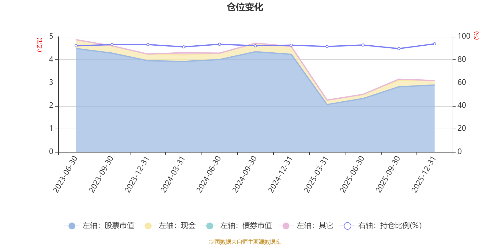 據(jù)定期報(bào)告數(shù)據(jù)統(tǒng)計(jì),成立以來平均股票倉位為92.37%,同類平均為85.83%。2025年末基金達(dá)到93.86%的最高倉位,2025年三季度末最低,為89.68%。