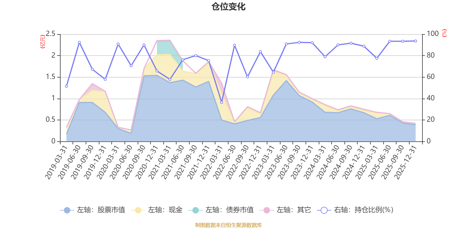 據(jù)定期報告數(shù)據(jù)統(tǒng)計,近三年平均股票倉位為87.3%,同類平均為72.57%。2025年末基金達到93.67%的最高倉位,2022年一季度末最低,為36.52%。