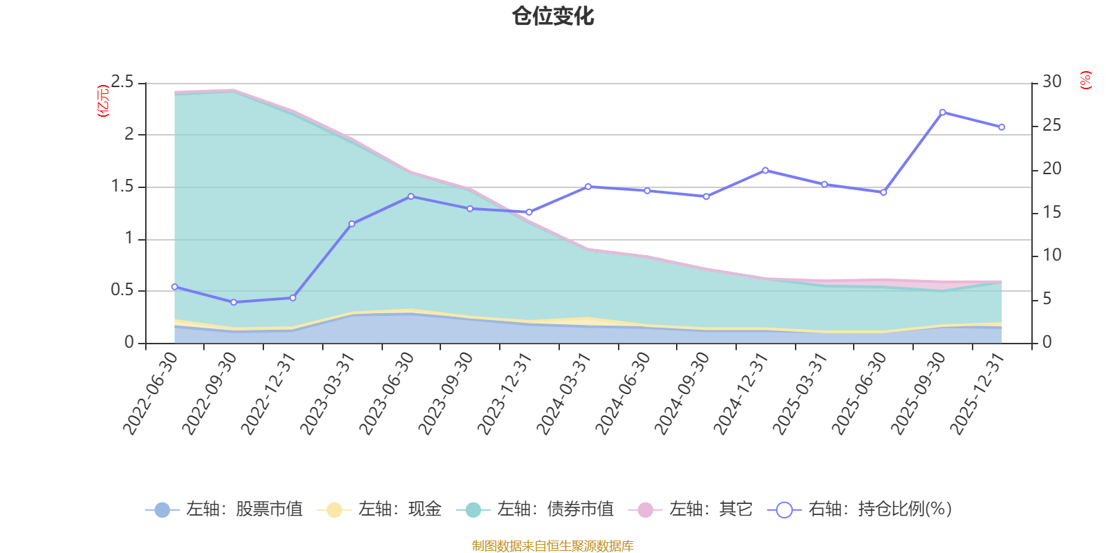 據(jù)定期報告數(shù)據(jù)統(tǒng)計,近三年平均股票倉位為18.42%,同類平均為19.2%。2025年三季度末基金達到26.62%的最高倉位,2022年三季度末最低,為4.72%。