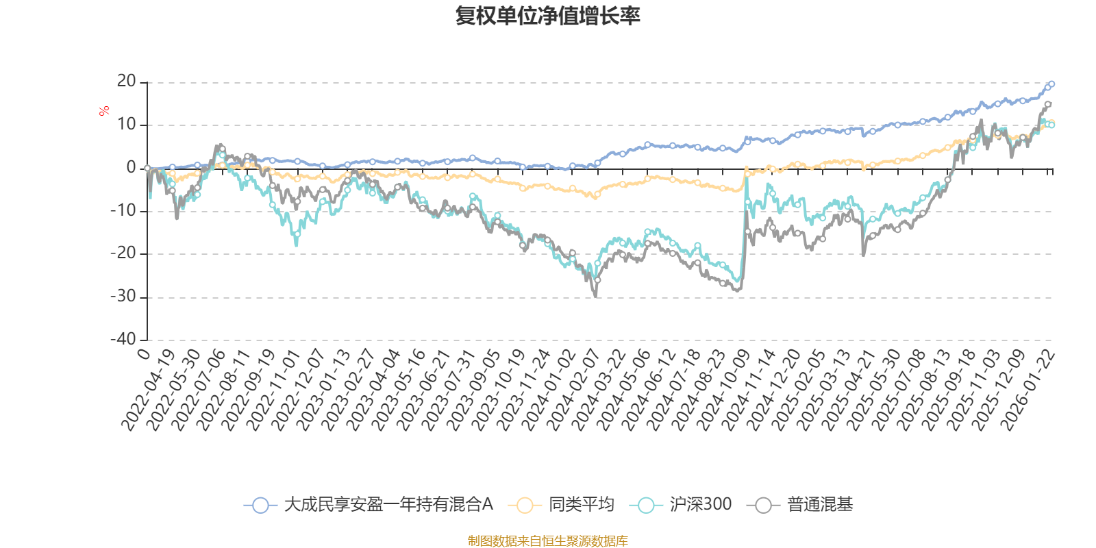 截至1月22日,大成民享安盈一年持有混合A近三個月復(fù)權(quán)單位凈值增長率為4.79%,位于同類可比基金86/629;近半年復(fù)權(quán)單位凈值增長率為7.25%,位于同類可比基金140/629;近一年復(fù)權(quán)單位凈值增長率為10.25%,位于同類可比基金203/626;近三年復(fù)權(quán)單位凈值增長率為18.11%,位于同類可比基金116/564。