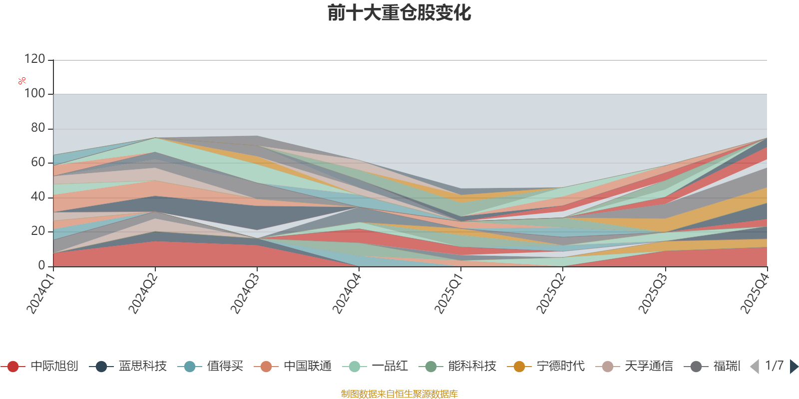 截至2025年四季度末,基金十大重倉股分別是新易盛、中際旭創(chuàng)、滬電股份、創(chuàng)源股份、寒武紀、生益科技、江波龍、仕佳光子、寧德時代、佰維存儲。