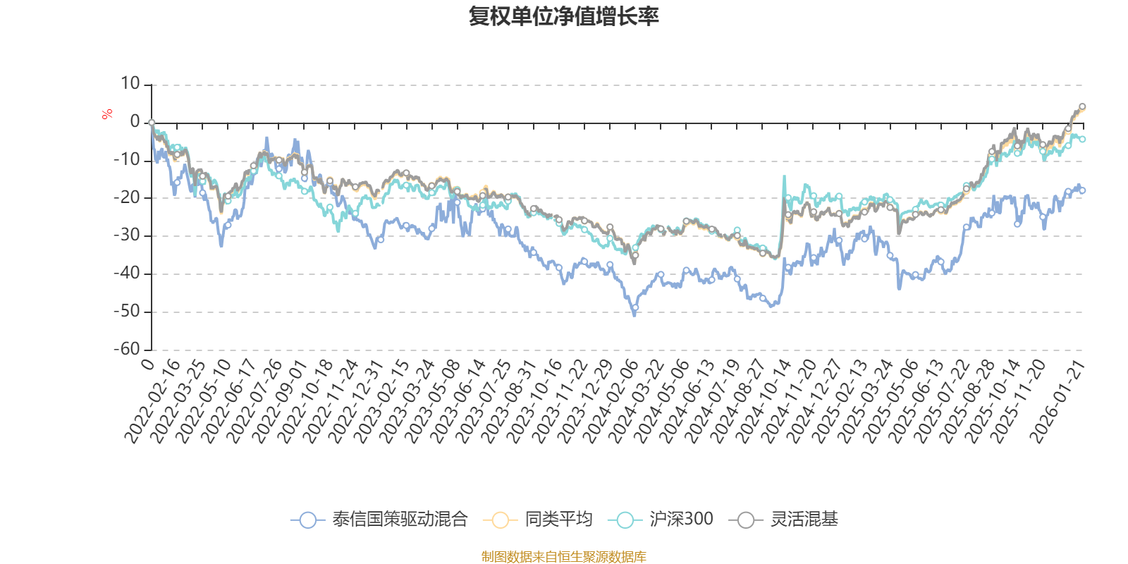 截至1月21日,泰信國策驅(qū)動混合近三個月復(fù)權(quán)單位凈值增長率為7.06%,位于同類可比基金720/1286;近半年復(fù)權(quán)單位凈值增長率為12.37%,位于同類可比基金877/1286;近一年復(fù)權(quán)單位凈值增長率為19.85%,位于同類可比基金917/1286;近三年復(fù)權(quán)單位凈值增長率為10.82%,位于同類可比基金774/1286。