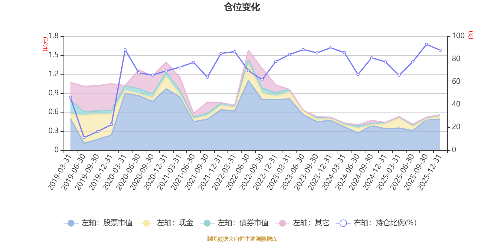 據(jù)定期報告數(shù)據(jù)統(tǒng)計,近三年平均股票倉位為81.9%,同類平均為72.57%。2025年三季度末基金達到92.95%的最高倉位,2019年上半年末最低,為11.08%。