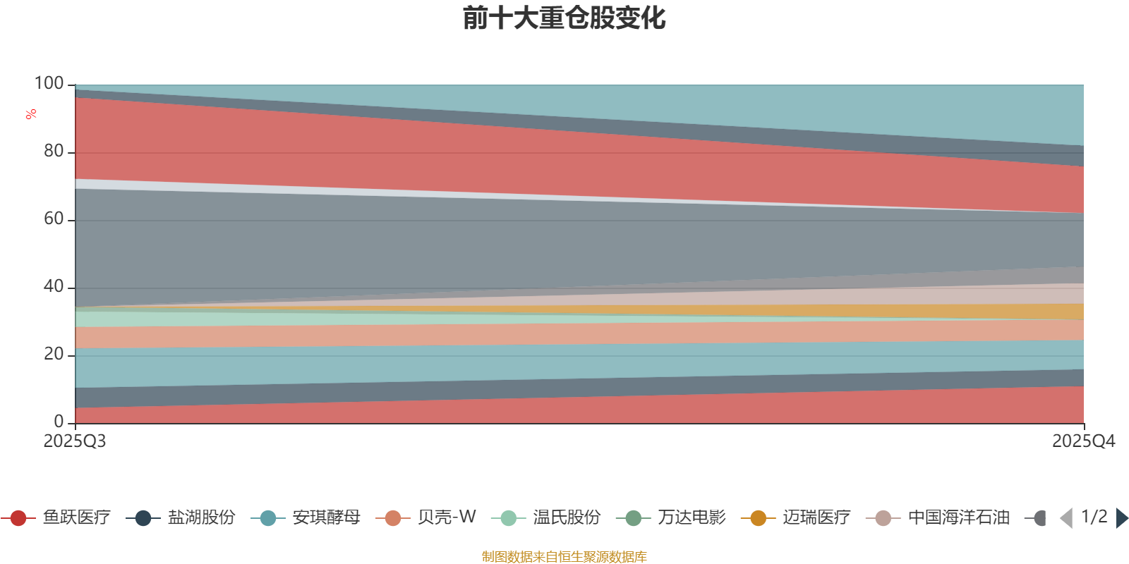 該基金持股集中度較高。截至2025年四季度末,基金十大重倉股分別是中國移動、美的集團(tuán)、魚躍醫(yī)療、安琪酵母、浙江龍盛、中國海洋石油、貝殼-W、鹽湖股份、騰訊控股、邁瑞醫(yī)療。