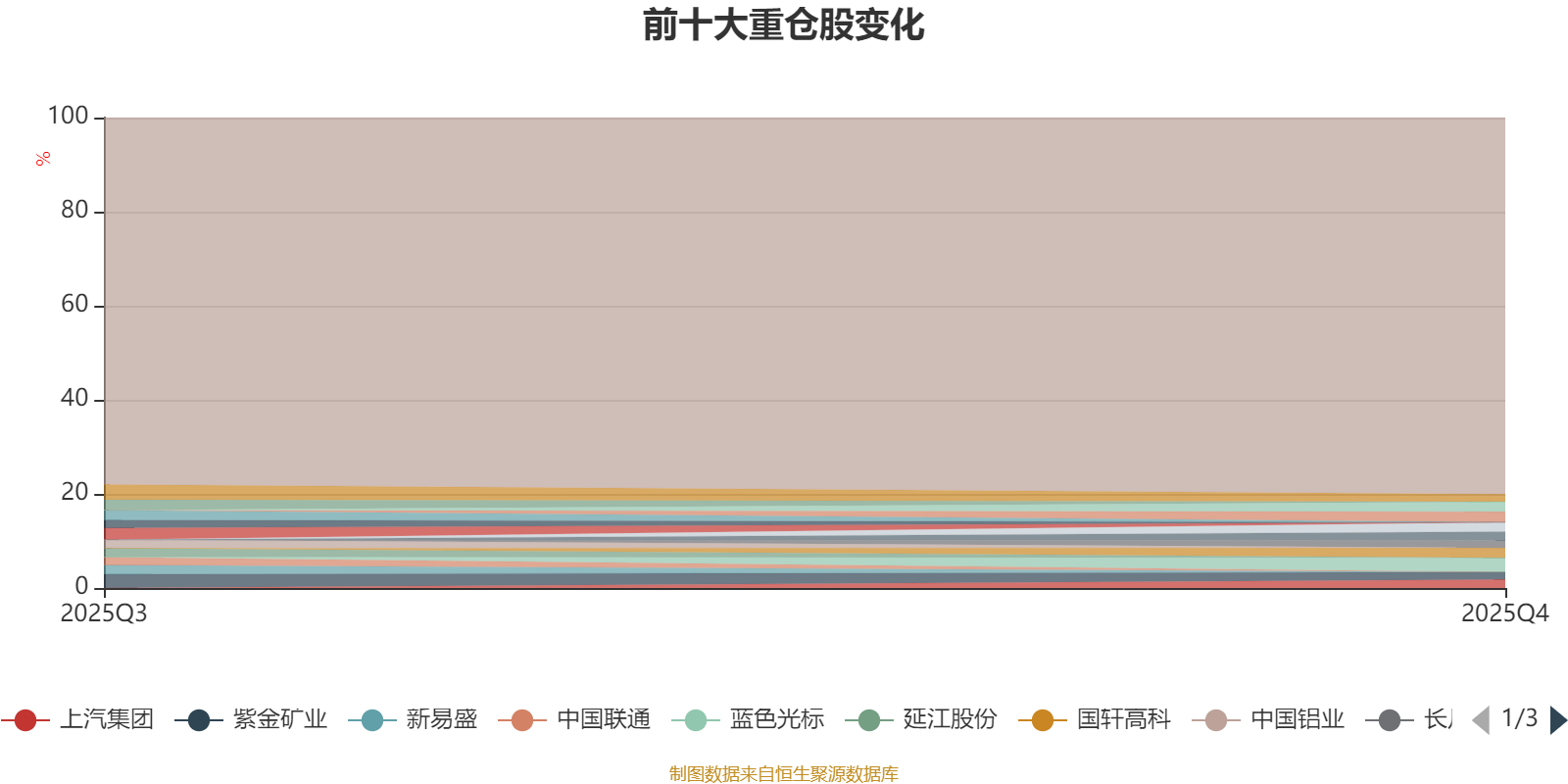 截至2025年四季度末,基金十大重倉股分別是藍色光標(biāo)、鵬輝能源、國軒高科、中信證券、TCL科技、潤澤科技、上汽集團、京東方A、紫金礦業(yè)、長川科技。