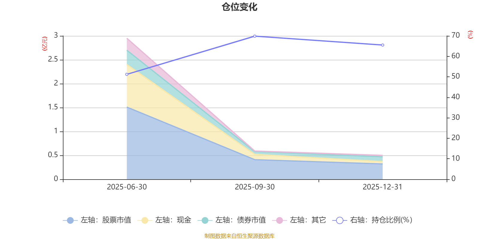 據(jù)定期報告數(shù)據(jù)統(tǒng)計,成立以來平均股票倉位為62.19%,同類平均為67.52%。2025年三季度末基金達到69.85%的最高倉位,2025年上半年末最低,為51.21%。