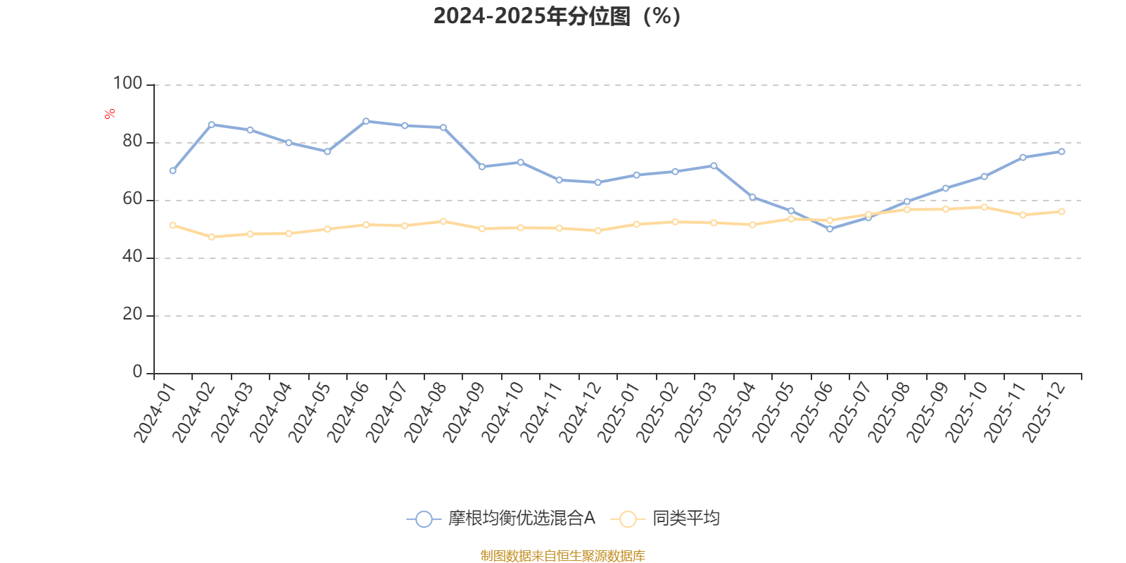 通過所選區(qū)間該基金凈值增長率分位圖,可以觀察該基金與同類基金業(yè)績比較情況。圖為坐標原點到區(qū)間內(nèi)某時點的凈值增長率在同類基金中的分位數(shù)。