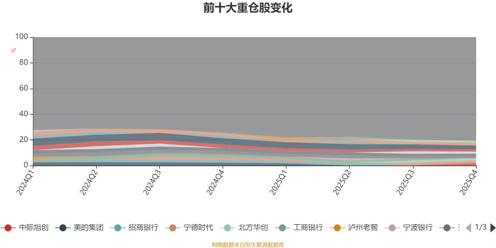 截至2025年四季度末,基金十大重倉股分別是貴州茅臺、中國平安、寧德時代、興業(yè)銀行、中際旭創(chuàng)、長江電力、伊利股份、北方華創(chuàng)、廣發(fā)證券、立訊精密。