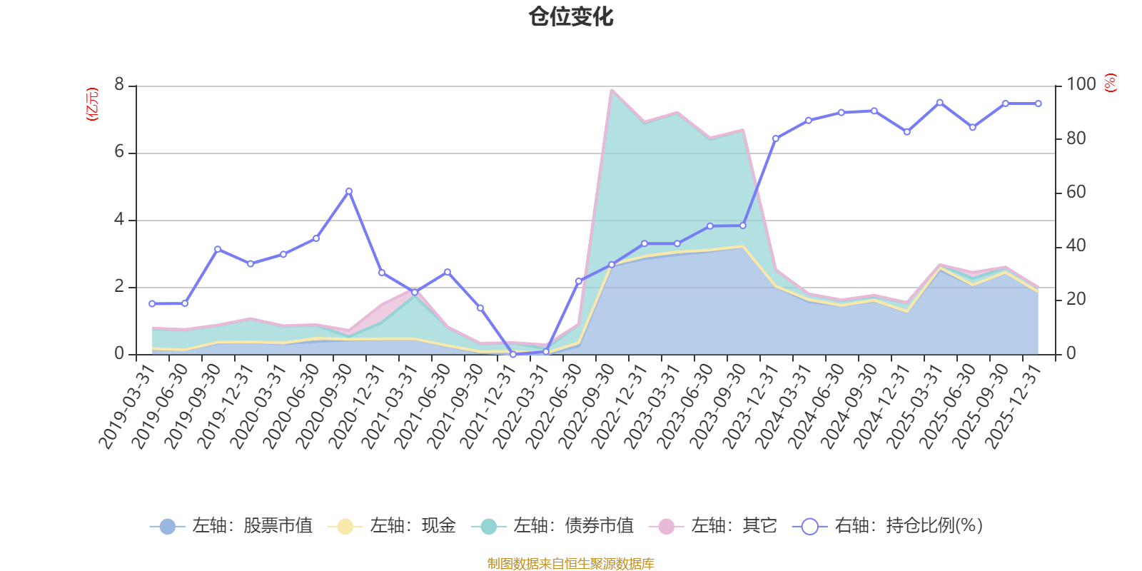 據(jù)定期報告數(shù)據(jù)統(tǒng)計,近三年平均股票倉位為77.73%,同類平均為72.57%。2025年一季度末基金達到93.74%的最高倉位,2021年末最低,為0.01%。