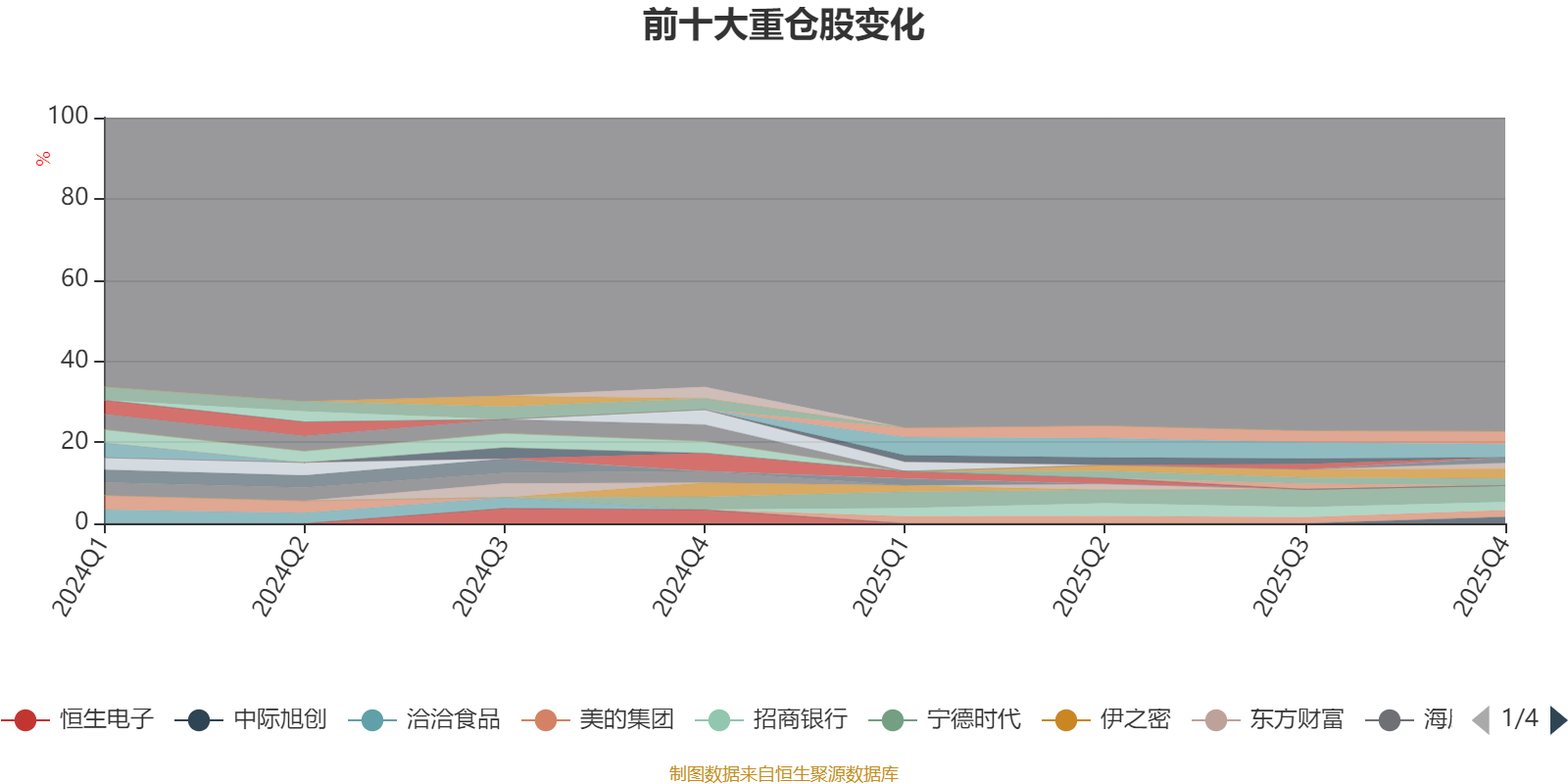 截至2025年四季度末,基金十大重倉股分別是寧德時代、貴州茅臺、中國平安、紫金礦業(yè)、招商銀行、興業(yè)銀行、美的集團、中際旭創(chuàng)、新易盛、寒武紀。