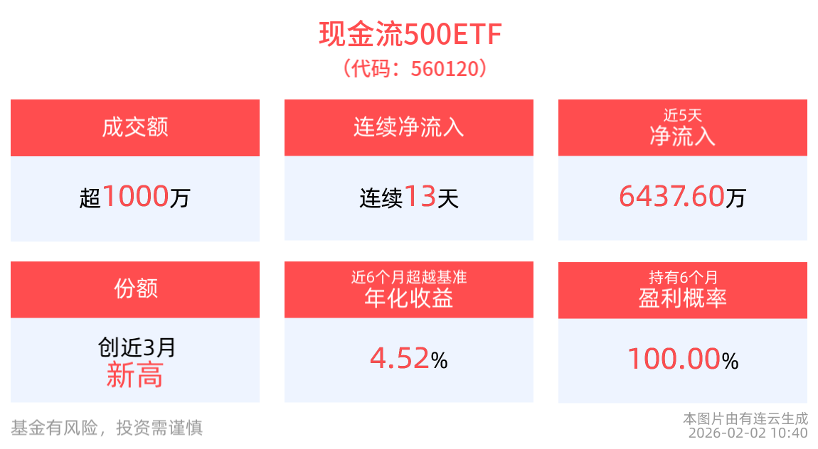 (原標(biāo)題:現(xiàn)金流500ETF(560120)連續(xù)13天凈流入,低位合計“吸金”1.2億元)
