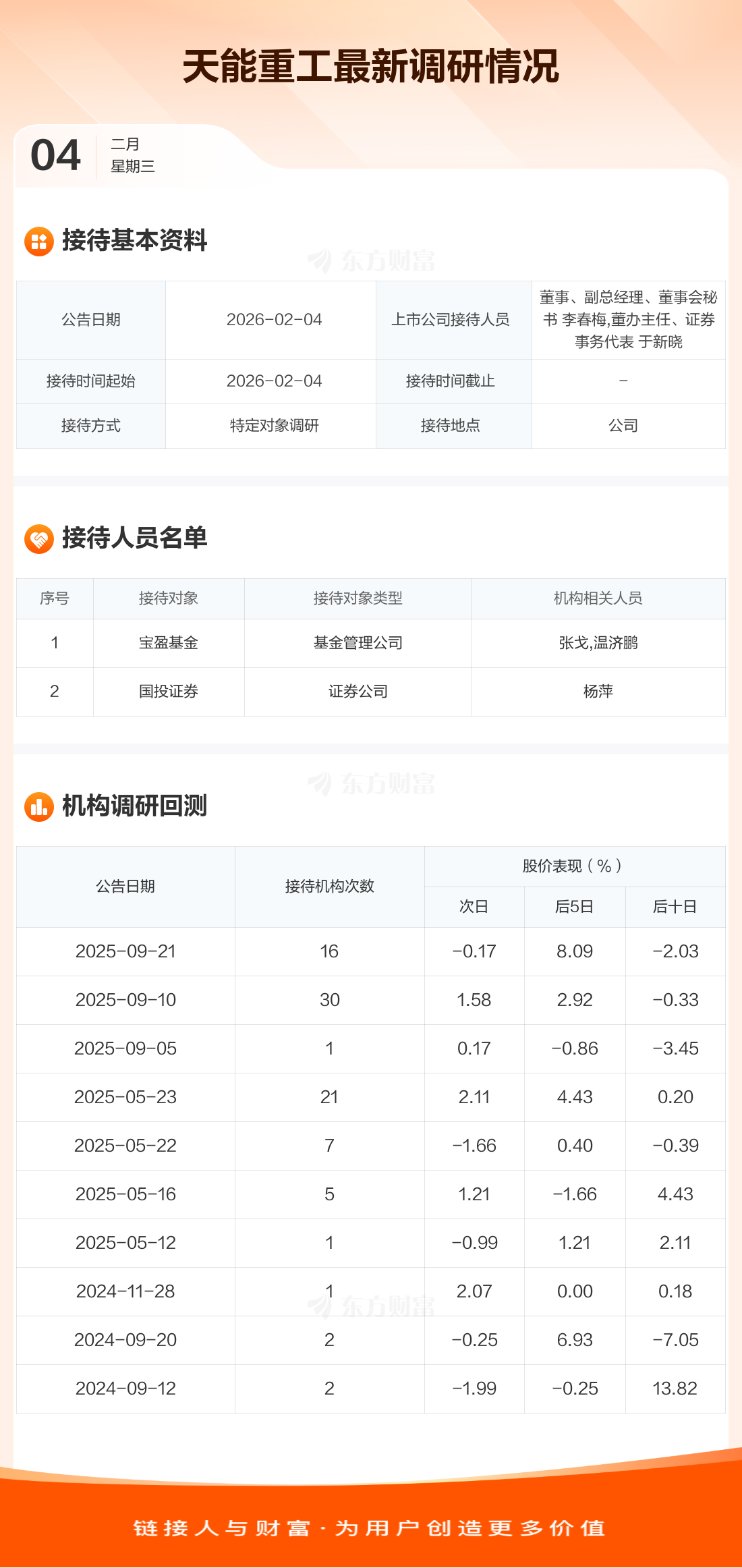 天能重工2月4日公告稱,2月4日接待寶盈基金等2家機構調(diào)研。接待人員包括董事、副總經(jīng)理、董事會秘書 李春梅,董辦主任、證券事務代表 于新曉。