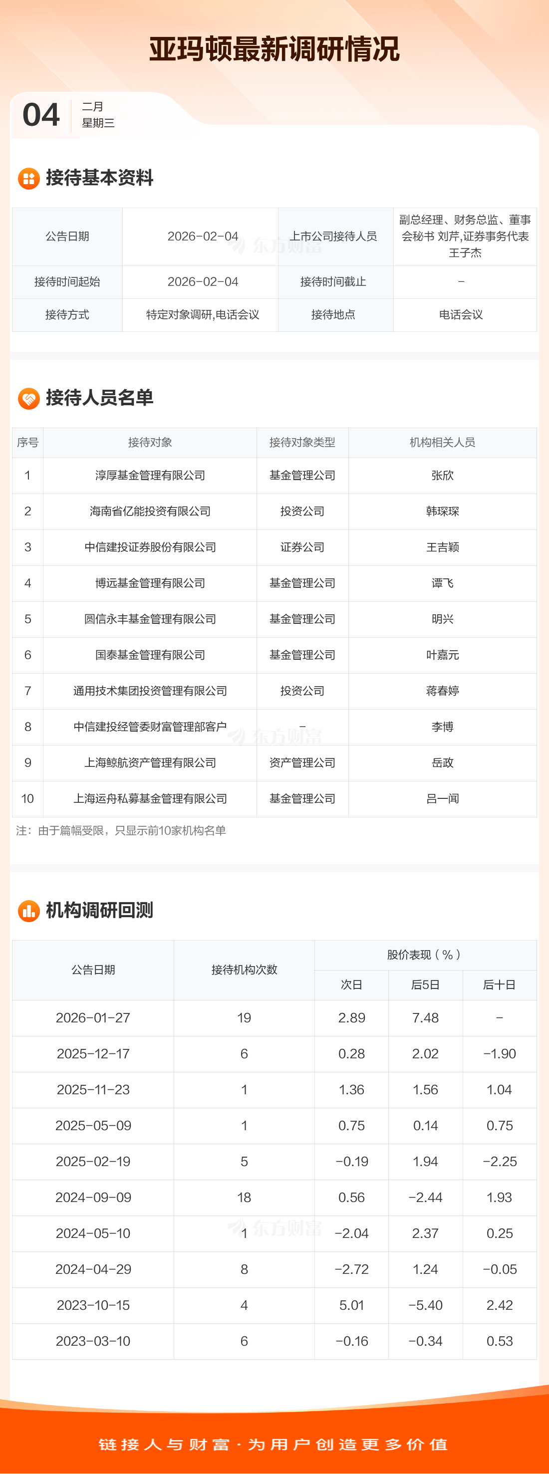 亞瑪頓2月4日公告稱,2月4日接待淳厚基金管理有限公司等32家機構(gòu)調(diào)研。接待人員包括副總經(jīng)理、財務總監(jiān)、董事會秘書 劉芹,證券事務代表 王子杰。