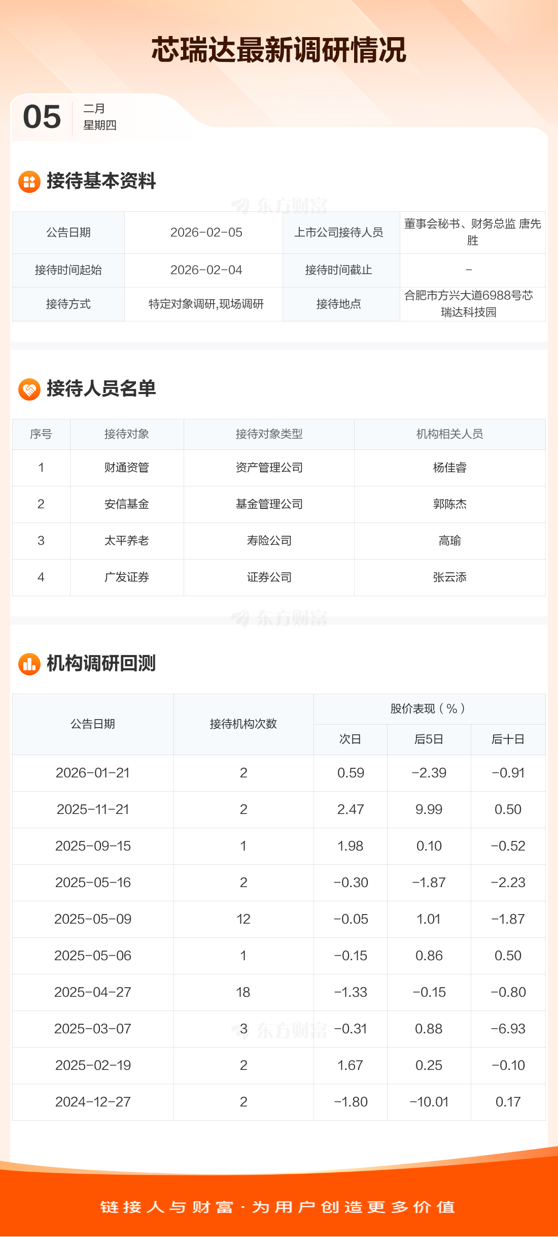芯瑞達(dá)2月5日公告稱,2月4日接待財(cái)通資管等4家機(jī)構(gòu)調(diào)研。接待人員包括董事會(huì)秘書、財(cái)務(wù)總監(jiān) 唐先勝。