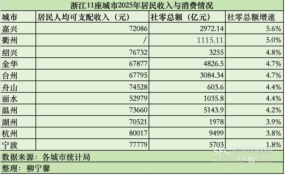 21世紀經濟報道梳理發(fā)現,浙江居民人均收入領先全國,但城市之間消費節(jié)奏出現分化。2025年,浙江“整體富”的特征更加明顯,同期全國居民人均可支配收入為4.3萬元。收入基礎扎實,這是浙江消費持續(xù)擴容的基礎條件。