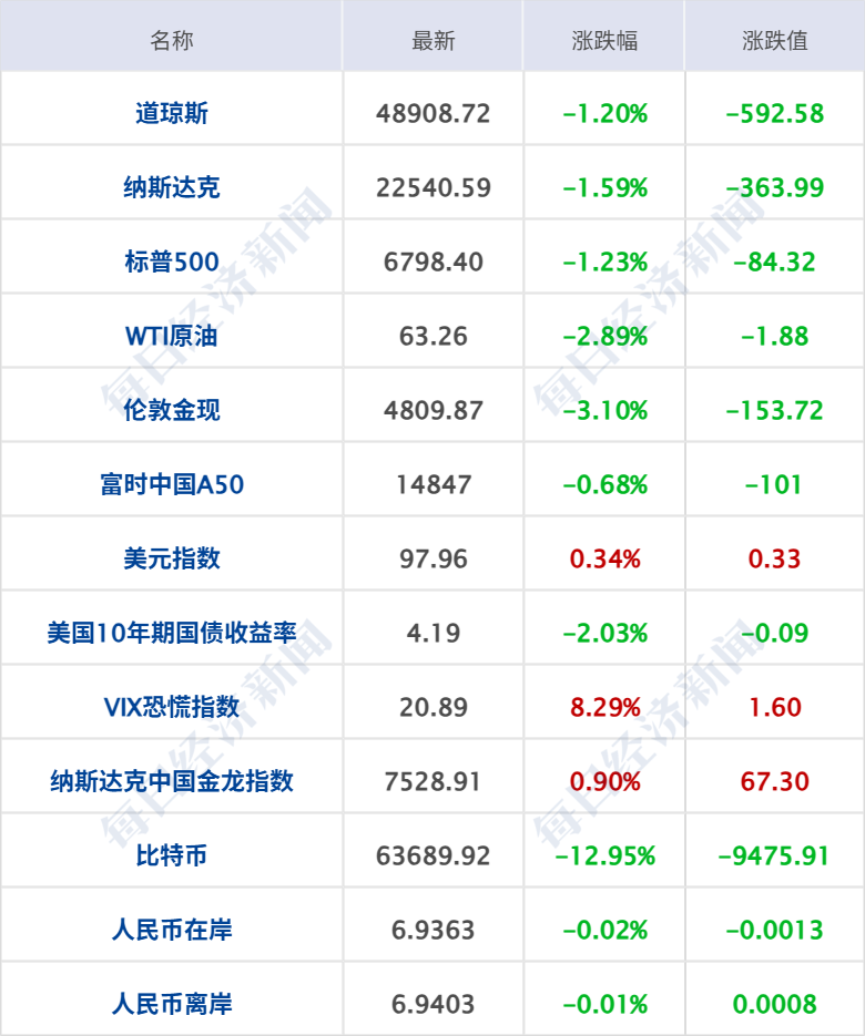美股三大指數(shù)集體收跌,道指跌1.2%,納指跌1.59%,標(biāo)普500指數(shù)跌1.23%,熱門科技股普跌,超微電腦、高通跌超8%,微軟跌近5%,亞馬遜跌超4%,AMD跌超3%,特斯拉跌超2%,英偉達(dá)跌超1%。納斯達(dá)克中國金龍指數(shù)收漲0.9%,中概股多數(shù)上漲,蔚來漲超5%,理想汽車漲超2%,嗶哩嗶哩漲超1%。