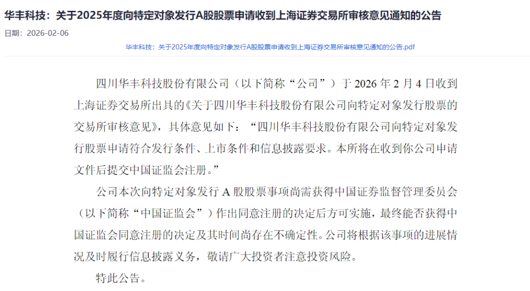 根據(jù)華豐科技最新發(fā)布的公告稱,公司于2026年2月4日收到上海證券交易所出具的《關(guān)于四川華豐科技股份有限公司向特定對象發(fā)行股票的交易所審核意見》,具體意見如下:“四川華豐科技股份有限公司向特定對象發(fā)行股票申請符合發(fā)行條件、上市條件和信息披露要求。本所將在收到你公司申請文件后提交中國證監(jiān)會注冊?!?/strong>