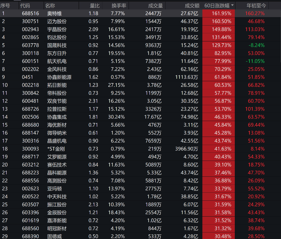 2025年12月中旬,A股光伏公司鈞達股份(002865.SZ)、東方日升(300118.SZ)的股價開始有所起色,并打開上行通道。彼時,市場上對于“太空光伏”的聲量并不多,但已有部分券商率先發(fā)布了有關“太空光伏”的研報。而幾乎在同一時期,“商業(yè)航天”題材開始成為二級市場主力。于是,前有馬斯克的“太空光伏”計劃,后有“商業(yè)航天”如火如荼,A股光伏板塊迎來了一場跨年盛宴——近兩個月內(nèi),奧特維(688516.SH)、邁為股份(300751.SZ)、鈞達股份(002865.SZ)、國晟科技(603778.SH)等“緋聞概念股”股價翻倍,東方日升等十多只光伏股漲幅超過50%。