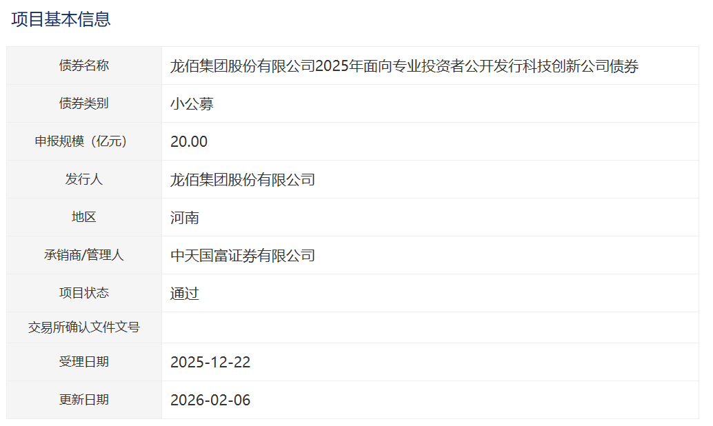 【大河財(cái)立方消息】2月7日消息,龍佰集團(tuán)股份有限公司2025年面向?qū)I(yè)投資者公開(kāi)發(fā)行科技創(chuàng)新公司債券項(xiàng)目獲深交所通過(guò)。本期債券擬發(fā)行金額20億元,承銷(xiāo)商/管理人為中天國(guó)富證券。