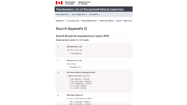 在加拿大增加關(guān)稅之前,在華生產(chǎn)并向加拿大出口產(chǎn)品的電動(dòng)汽車(chē)企業(yè)主要是特斯拉和極星。第一財(cái)經(jīng)記者發(fā)現(xiàn),比亞迪在深圳和西安制造的乘用車(chē)也出現(xiàn)在加拿大交通部的附錄G預(yù)批準(zhǔn)計(jì)劃中。據(jù)加交通部,附錄G允許汽車(chē)制造商進(jìn)口少于2500輛的已符合加拿大機(jī)動(dòng)車(chē)安全標(biāo)準(zhǔn)(CMVSS)的新型外國(guó)制造車(chē)輛,但該項(xiàng)目已經(jīng)于去年7月起暫停申請(qǐng),為期一年。目前無(wú)法得知比亞迪具體申請(qǐng)時(shí)間。