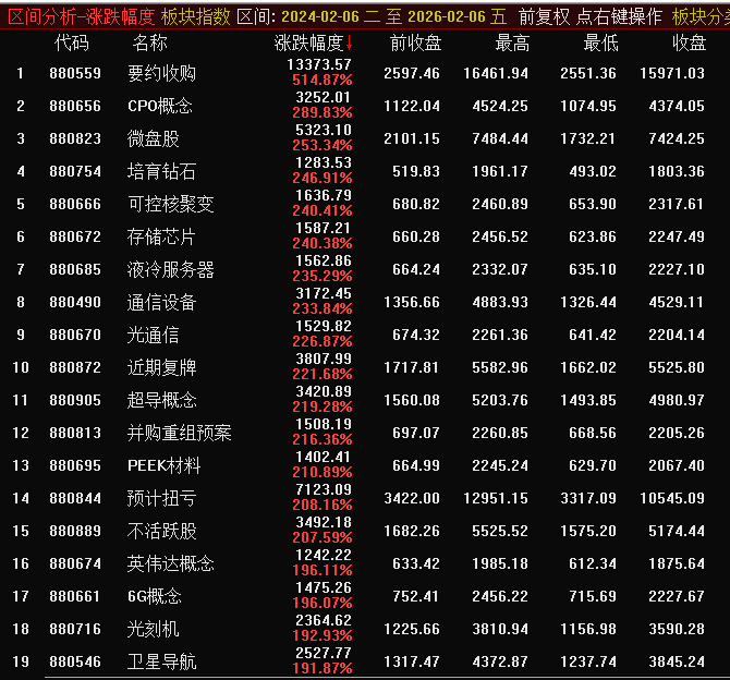 行業(yè)板塊風格分類方面亦牛多熊少。除了釀酒、次新、山西板塊2年來錄得下跌外,其余不同程度拉升。其中,要約收購指數以514.87%的漲幅位居頭名,CPO、微盤、培育鉆石、可控核聚變、存儲芯片等十多個分類指數漲幅超過了200%。