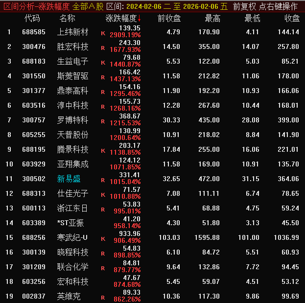 通達信統(tǒng)計數據顯示,2024年2月5日最低點起截至本周收盤:上證50、深證成指、中小100、創(chuàng)業(yè)板指、科創(chuàng)50、深證50、北證50七大成分指數的區(qū)間漲幅分別是40.39%、80.99%、78.09%、118.24%、123.74%、59.60%、114.44%;上證指數、深證綜指、中小綜指、創(chuàng)業(yè)板綜、科創(chuàng)綜指5大綜合指數的戰(zhàn)績分別是54.29%、90.44%、90.65%、127.39%、132.42%。從衡量整個A股的“平均股價指數”來看,全周漲幅是108.32%。