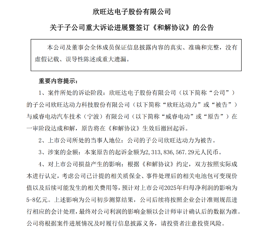 2月6日晚,欣旺達子公司欣旺達動力科技股份有限公司與威睿電動汽車技術(shù)(寧波)有限公司在一審階段達成和解,原告將在《和解協(xié)議》生效后撤回起訴。