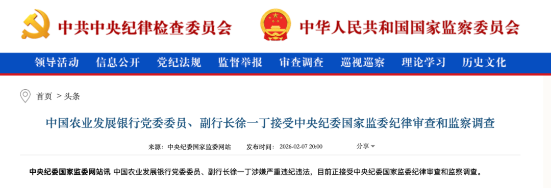 2月7日晚間,中央紀(jì)委國家監(jiān)委網(wǎng)站顯示,中國農(nóng)業(yè)發(fā)展銀行黨委委員、副行長徐一丁涉嫌嚴(yán)重違紀(jì)違法,目前正接受中央紀(jì)委國家監(jiān)委紀(jì)律審查和監(jiān)察調(diào)查。