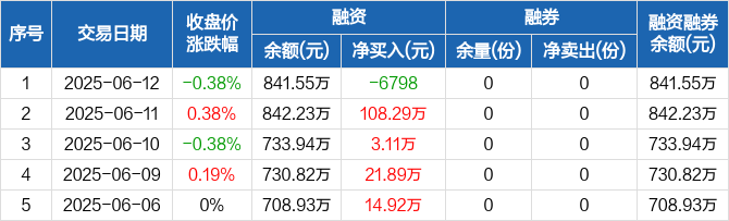 融資方面,當(dāng)日融資買(mǎi)入222.8萬(wàn)元,融資償還223.48萬(wàn)元,融資凈償還6798元。融券方面,融券賣出0份,融券償還0份,融券余量0份,融券余額0元。融資融券余額合計(jì)841.55萬(wàn)元。