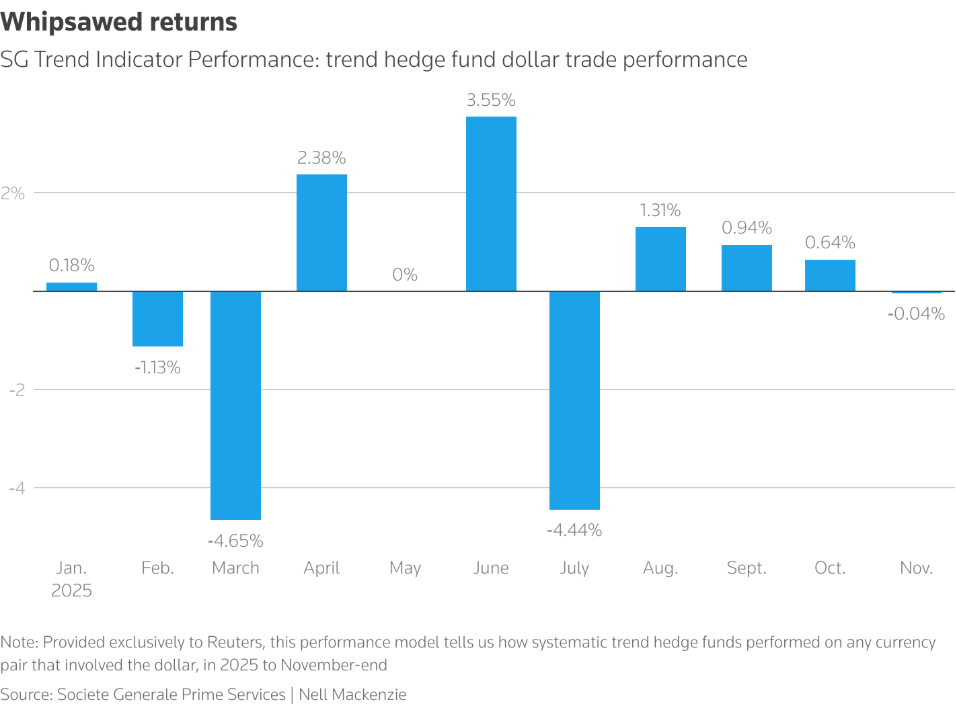 在2025年至11月底期間,系統(tǒng)性趨勢對沖基金在任何涉及美元的貨幣對上的表現(xiàn)