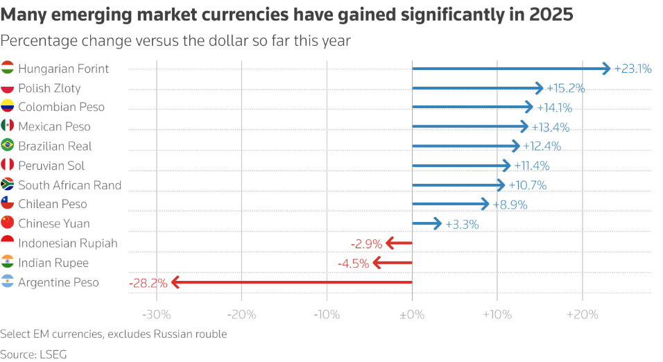 墨西哥比索與巴西雷亞爾同樣躋身今年表現(xiàn)最佳的新興市場貨幣行列。這些國家的央行政策穩(wěn)健,利率處于高位,其中巴西的基準利率更是達到15%,創(chuàng)下20年來的新高。此外,兩國的貨幣與債券市場準入門檻較低,易于投資者參與。