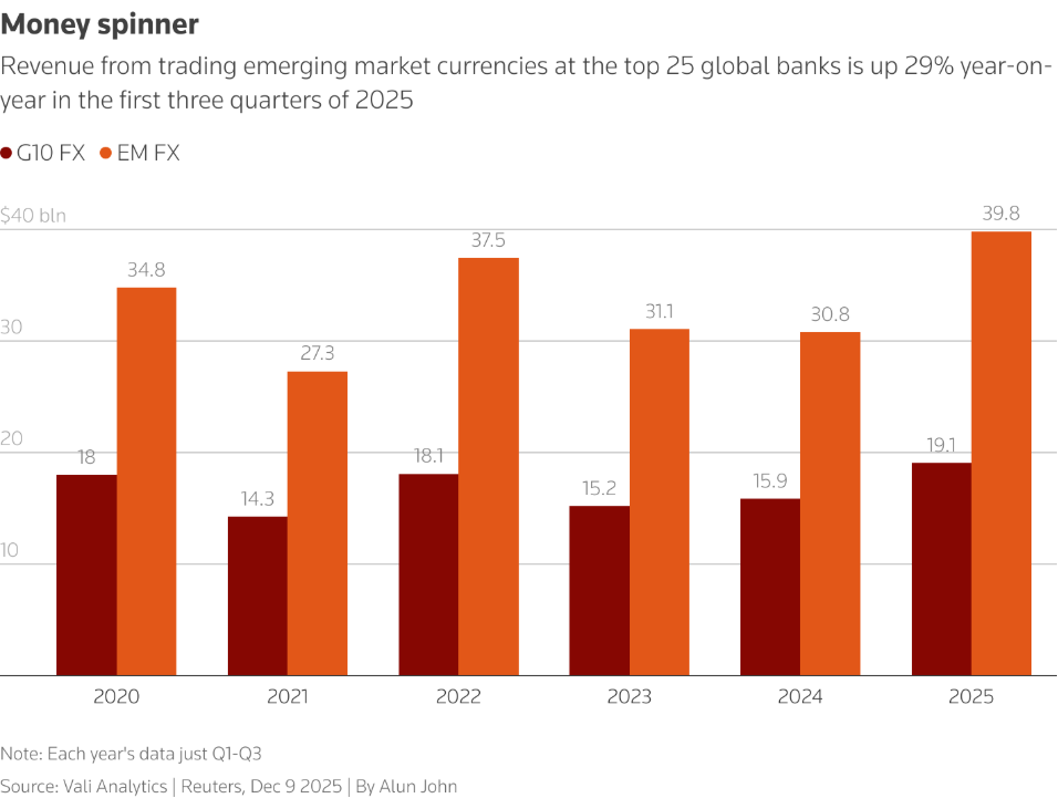 Vali Analytics為路透社整理的數(shù)據(jù)顯示,新興市場貨幣交易已成為銀行的盈利利器。今年前九個月,全球前25大銀行通過此類交易斬獲近400億美元收入,創(chuàng)下歷史最佳業(yè)績。該數(shù)據(jù)公司的分析還顯示,這一收入規(guī)模是這些銀行從十國集團貨幣交易中獲利的兩倍多,十國集團貨幣涵蓋美元、英鎊、歐元等主要幣種。
