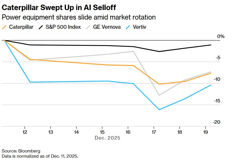 以下的圖表顯示,市場(chǎng)輪動(dòng)之際動(dòng)力設(shè)備股也難逃下跌態(tài)勢(shì),卡特彼勒與GE Vernova、Vertiv 則因自身被卷入AI拋售大浪潮而遭遇更加慘烈的跌幅。