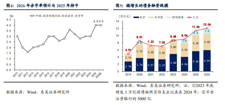此外,與市場對“超量刺激”的期待不同,報告認(rèn)為2026年政策將“以穩(wěn)為主”。貨幣政策方面,隨著私人部門縮表壓力緩解,央行主動維持充裕流動性的必要性下降。財政政策方面,重點將是化債和民生投資,而非大規(guī)模逆周期刺激。報告預(yù)計赤字率維持4%,專項債4.5萬億元,超長期特別國債1.5萬億元。