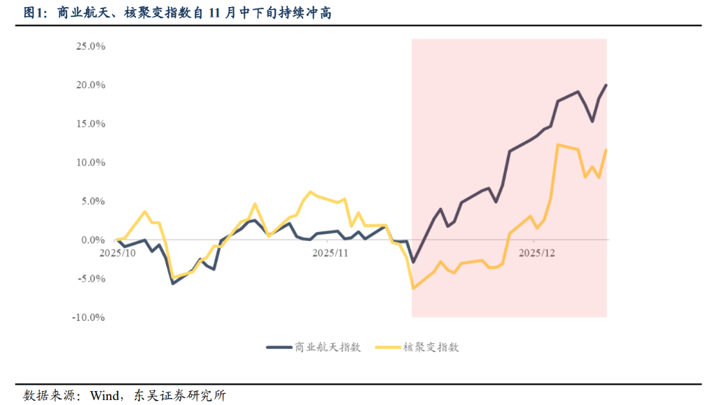 根據(jù)招標(biāo)官網(wǎng)統(tǒng)計(jì),12 月 1 日至 12 日中科院合肥等離子體物理研究所及聚變新能安徽公布中標(biāo)項(xiàng)目總額24.02 億元,同比 11 月招標(biāo)金額大幅增加。作為十五五未來(lái)產(chǎn)業(yè)分支中相對(duì)具備景氣能見度的分支,商業(yè)航天短期滯漲時(shí),具備相似題材屬性的核聚變板塊便率先以高斜率實(shí)現(xiàn)補(bǔ)漲。我國(guó)能源強(qiáng)國(guó)建設(shè)與北美 AI 能源危機(jī)敘事實(shí)現(xiàn)共振。年底中央經(jīng)濟(jì)工作會(huì)議制定能源強(qiáng)國(guó)建設(shè)規(guī)劃綱要,加快新型能源體系建設(shè),北美缺電敘事亦甚囂塵上,英偉達(dá) 12 月 16-19 日舉行“電力危機(jī)”閉門峰會(huì),特朗普媒體科技集團(tuán)也將與核聚變公司 TAE 在 2026 年合作開發(fā)核聚變項(xiàng)目。總結(jié)看,盡管距離大規(guī)模使用為時(shí)尚早,但可控核聚變及釷基核裂變作為未來(lái)電力能源重要產(chǎn)業(yè)趨勢(shì)具備中長(zhǎng)期敘事支撐。