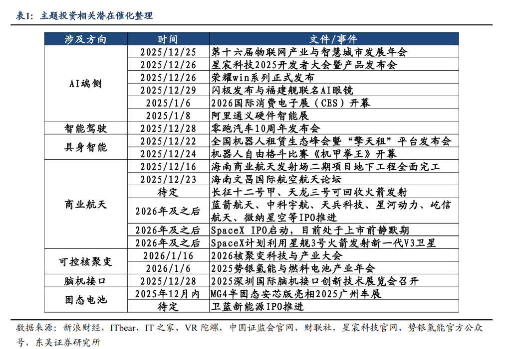 觀點(diǎn)上周我們討論了此前市場(chǎng)調(diào)整主要來(lái)自三方面因素:全球流動(dòng)性壓力、海外“AI 泡沫”焦慮,以及 A 股 Q4“結(jié)賬季”博弈。本周看,美國(guó) 11 月通脹意外放緩、10 月非農(nóng)超預(yù)期減少,日本如期加息25bp,此外阿聯(lián)酋主權(quán)財(cái)富基金有望注資 OpenAI,也一定程度上緩解了全球投資者的“AI 泡沫”焦慮,12 月以來(lái)壓制海內(nèi)外市場(chǎng)流動(dòng)性和風(fēng)險(xiǎn)偏好的幾大不確定性因素陸續(xù)落地,市場(chǎng)迎來(lái)修復(fù)良機(jī)。方向上,我們此前提出,2025 年中經(jīng)濟(jì)工作會(huì)議更偏向“調(diào)結(jié)構(gòu)”,市場(chǎng)或演繹結(jié)構(gòu)性行情。擴(kuò)內(nèi)需是首要任務(wù),但文字表述穩(wěn)健積極而并不急迫,同時(shí) 11 月經(jīng)濟(jì)、金融數(shù)據(jù)顯示出國(guó)內(nèi)經(jīng)濟(jì)基本面復(fù)蘇仍待鞏固,對(duì)應(yīng)相關(guān)方向短期較難跑出趨勢(shì)超額,科技產(chǎn)業(yè)趨勢(shì)品種更易凝聚資金共識(shí)。目前投資者對(duì)于 AI 算力中的景氣環(huán)節(jié)、芯片半導(dǎo)體、儲(chǔ)能等的邏輯理解較為充分,那么泛科技主題、賽道方向還有哪些投資機(jī)會(huì)?